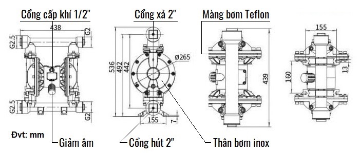 Bơm màng GODO QBY3-50PTFF thân Inox, màng Teflon