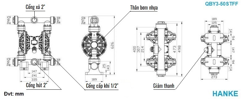 Bơm màng khí nén GODO QBY3-50STFF 2″ thân Nhựa PP